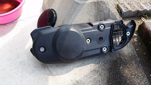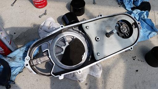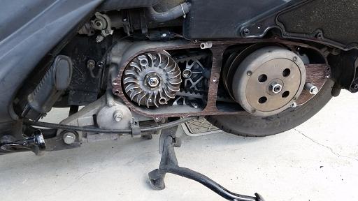 二つのカバーを全て取り外し、クラッチとVベルトが収まる部分が見えます。