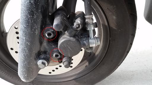 キャリパーを固定している2箇所の六角ボルトを外します。