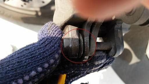 古いパッド外す為、まずは赤丸部分のパッドを固定しているピンをロックしている