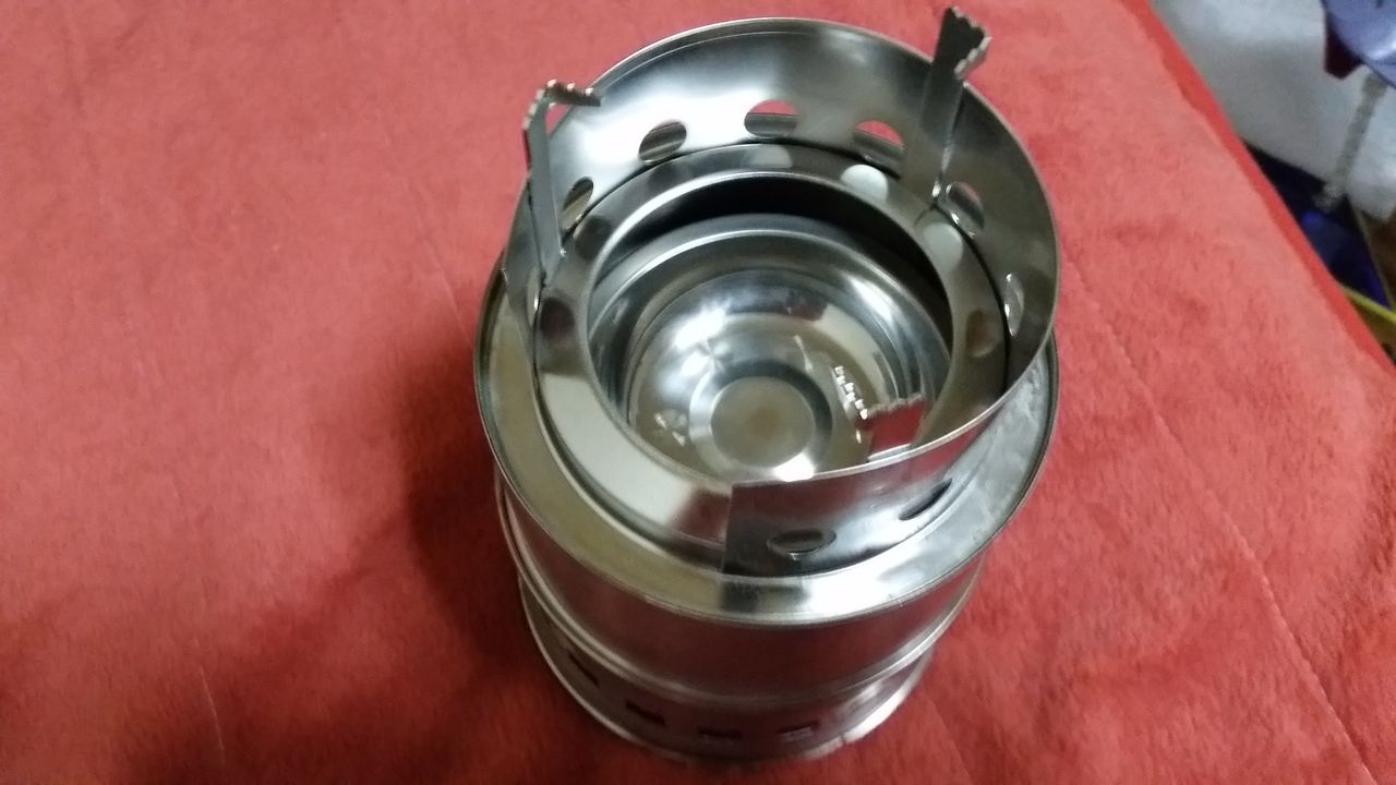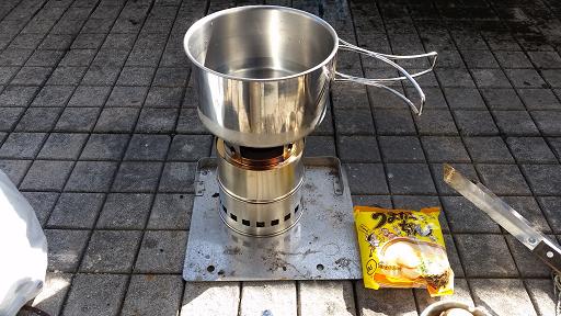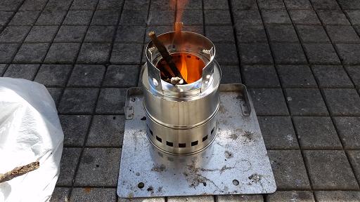 外で使ってみます。ウッドストーブは下部が何もない構造なので、灰受けの容器などを下に